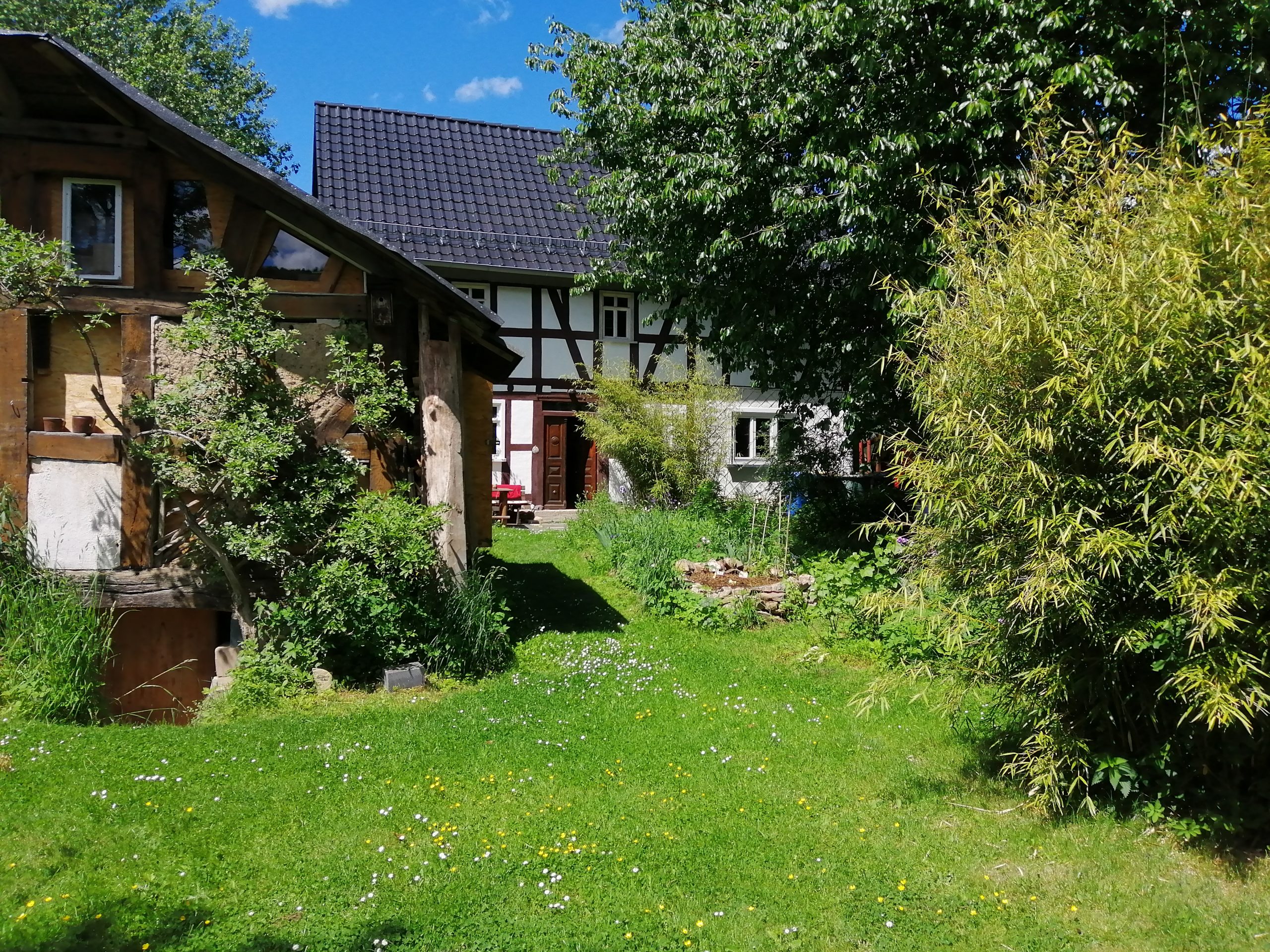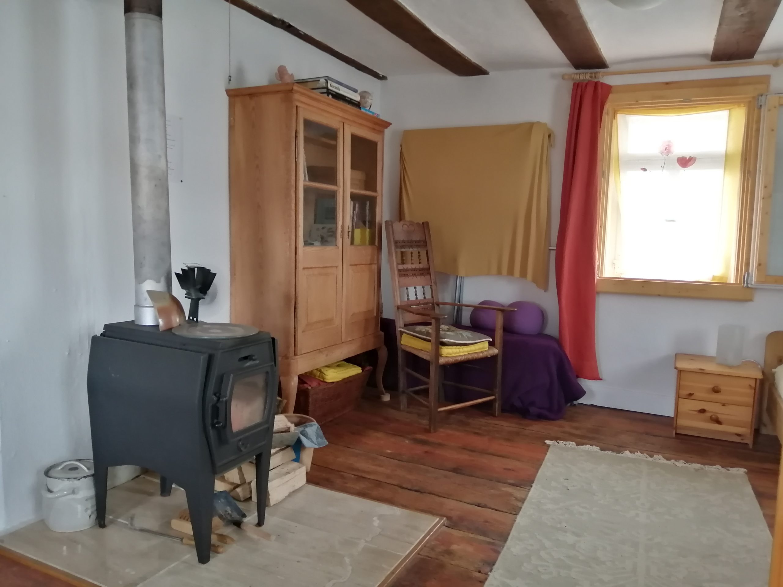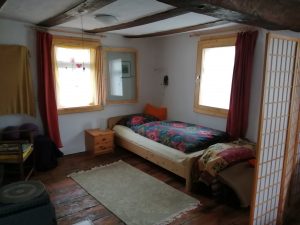 Das Gebäude steht mitten im Dorf auf 1000qm Grund. Es ist ein denkmalgeschütztes Fachwerkhaus, stammt aus dem 19. Jahrhundert und befindet sich in einem sehr einfachen Zustand. Es gibt Einzelöfen und ich heize mit Holz. Zum Teil sind die Fenster noch mit alten, handgezogenen Scheiben einfach verglast. Ich liebe die kleinen Lufteinschlüsse und Wellen. Dies habe ich ganz bewusst so gelassen, weil sich hierdurch ein natürliches Raumklima ergibt. Ich versuche, den Zustand möglichst mit natürlichen Mitteln zu erhalten. Wenn Du mit dem Feuern nicht zurecht kommst, habe ich die Möglichkeit der Zusatzheizung mit Strom. Die Böden und auch die Treppe sind uneben – das erfordert Achtsamkeit. Das ganze Ambiente führt zu einer Entschleunigung – ein bisschen so wie früher. Ich nutze wenig Elektrogeräte. Wenn Dir also etwas wichtig ist, dann erkundige Dich bitte vor dem Besuch. Natürlich gibt es warmes Wasser und auch wlan. Das Bad hat eine kleine Wanne. Es gibt zwei Toiletten. Rauchen ist nur draußen möglich.